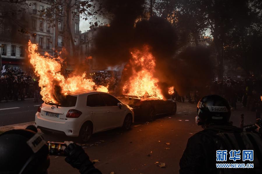 這是11月28日在法國(guó)巴黎拍攝的游行示威中被點(diǎn)燃的車輛。