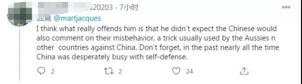 在這條推特下邊,許多網友為馬丁·雅克點贊。其中一位網友說道:“我認為真正讓他惱火的是,他沒想到中國人也會對他們的不當行為發(fā)表評論,這是澳大利亞人和其他國家對付中國的慣用伎倆。別忘了,在過去幾乎所有的時間里,中國都在拼命地進行自衛(wèi)。”