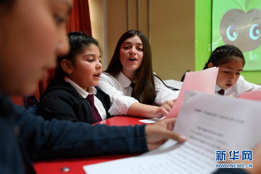 2019年10月11日,洛蕾托·約斯(中)在智利南部紐夫萊大區(qū)的圣尼古拉斯中學(xué)的課堂上學(xué)習(xí)漢語。新華社發(fā)(豪爾赫·比列加斯攝)