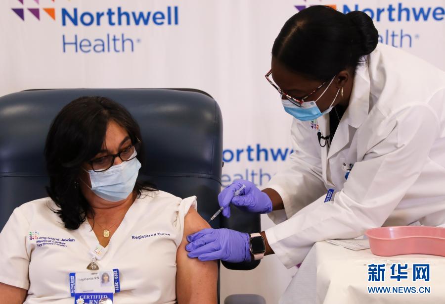 12月14日,在美國(guó)紐約長(zhǎng)島猶太醫(yī)療中心,護(hù)士斯蒂芬妮·凱爾(左)接種新冠疫苗。新華社記者王迎攝