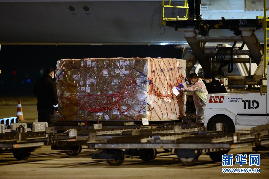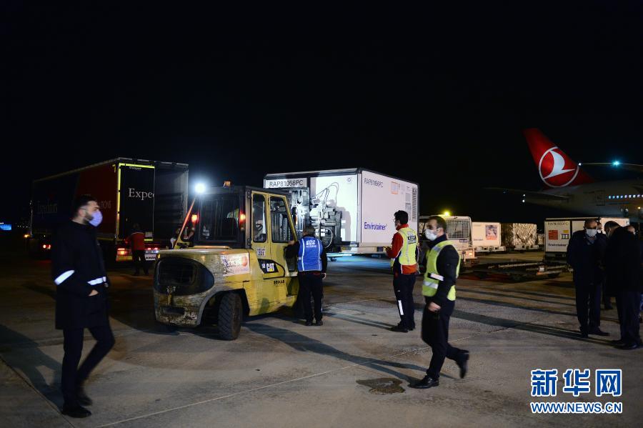 12月30日,在土耳其安卡拉的埃森博阿機場,工作人員從飛機上搬運中國科興公司生產的新冠疫苗。新華社發(穆斯塔法·卡亞攝)