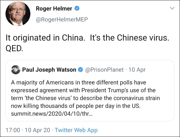 4月,赫爾默轉發(fā)了一條關于特朗普使用“中國病毒”的推特,并狡辯稱:“它起源自中國,它就是中國病毒。”