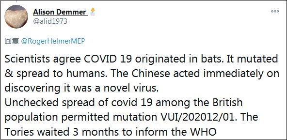 還有一名網(wǎng)友對比稱:“科學家同意新冠病毒起源自蝙蝠,變異后傳播給人類,中國人發(fā)現(xiàn)這是一種新病毒后,立即采取了行動。新冠病毒在英國人口中無限制的傳播,導致了變異新冠病毒(VUI/202012/01),保守黨等了3個月才通知世衛(wèi)組織。”