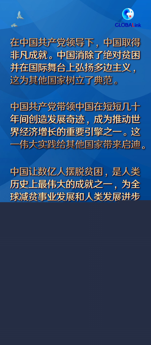 “新中國成立之時,中國還很貧窮。中國共產(chǎn)黨帶領(lǐng)中國在短短幾十年間創(chuàng)造發(fā)展奇跡,成為推動世界經(jīng)濟(jì)增長的重要引擎之一。這一偉大實踐給其他國家?guī)韱⒌??!?/p>